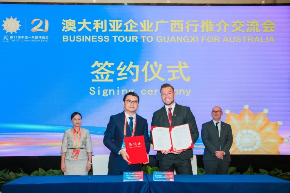 9月24日,在廣西南寧舉辦的第21屆中國—東盟博覽會澳大利亞企業(yè)廣西行推介交流會上,廣西五礦集團(tuán)所屬五礦資源公司與澳洲NEW START集團(tuán)共同簽署鋁錠購銷意向協(xié)議,東博會秘書處秘書長韋朝暉、副秘書長梁藝光、澳大利亞駐廣州總領(lǐng)事康天幕見證簽約儀式。同時為就協(xié)議及合作事項進(jìn)行深入磋商,雙方于25日召開座談會并達(dá)成系列意向共識。